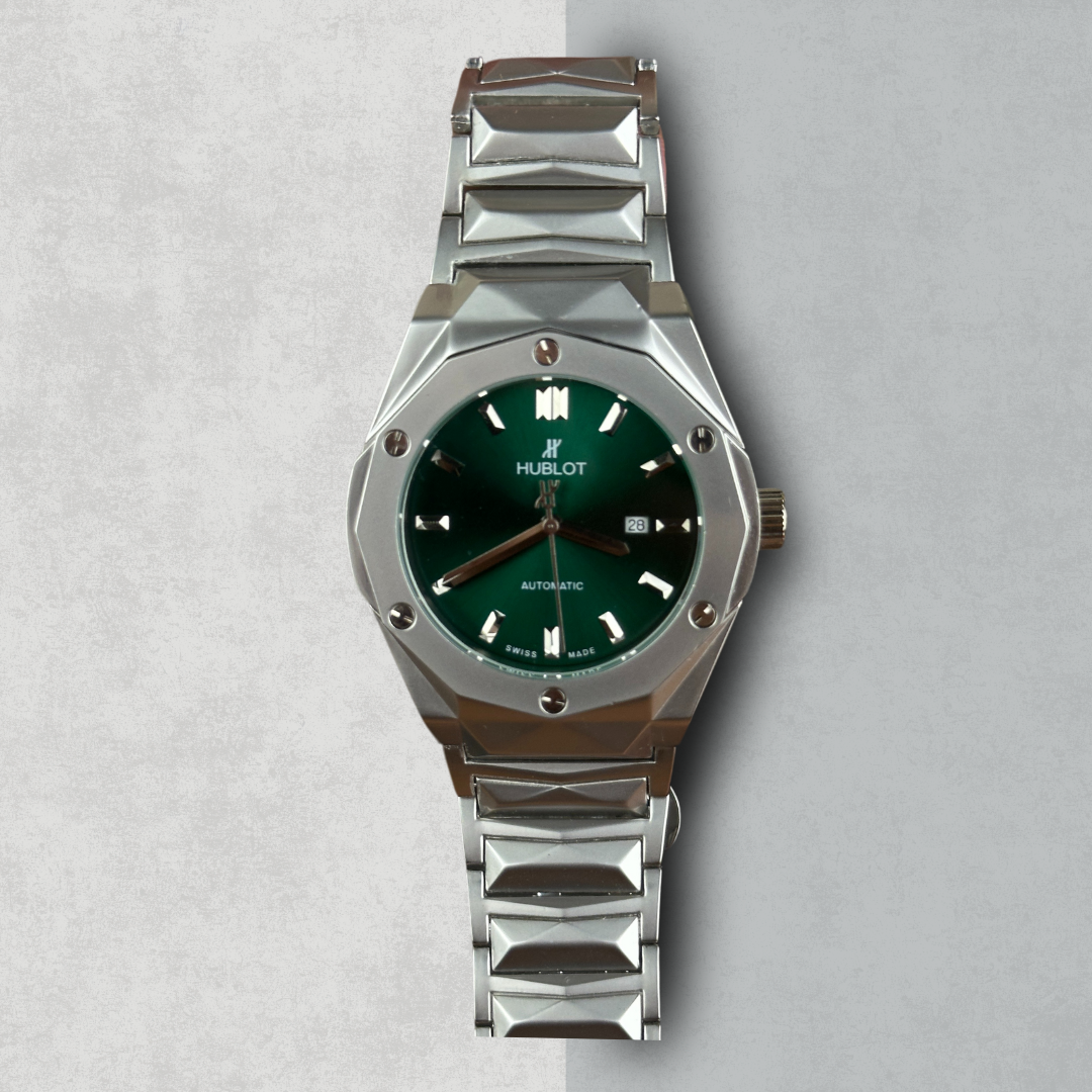 The Emerald Horizon Classic isn’t just another dress watch—it’s your bold signature, blending modern elegance with a standout green that speaks for itself.