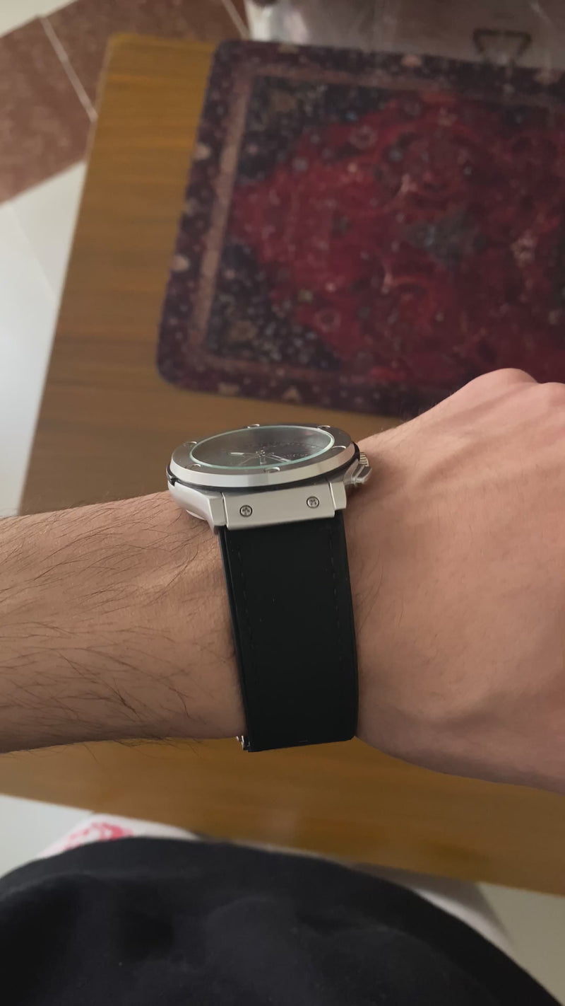 - Case: Brushed stainless steel case with Hublot’s signature bezel screws for a bold, modern look.