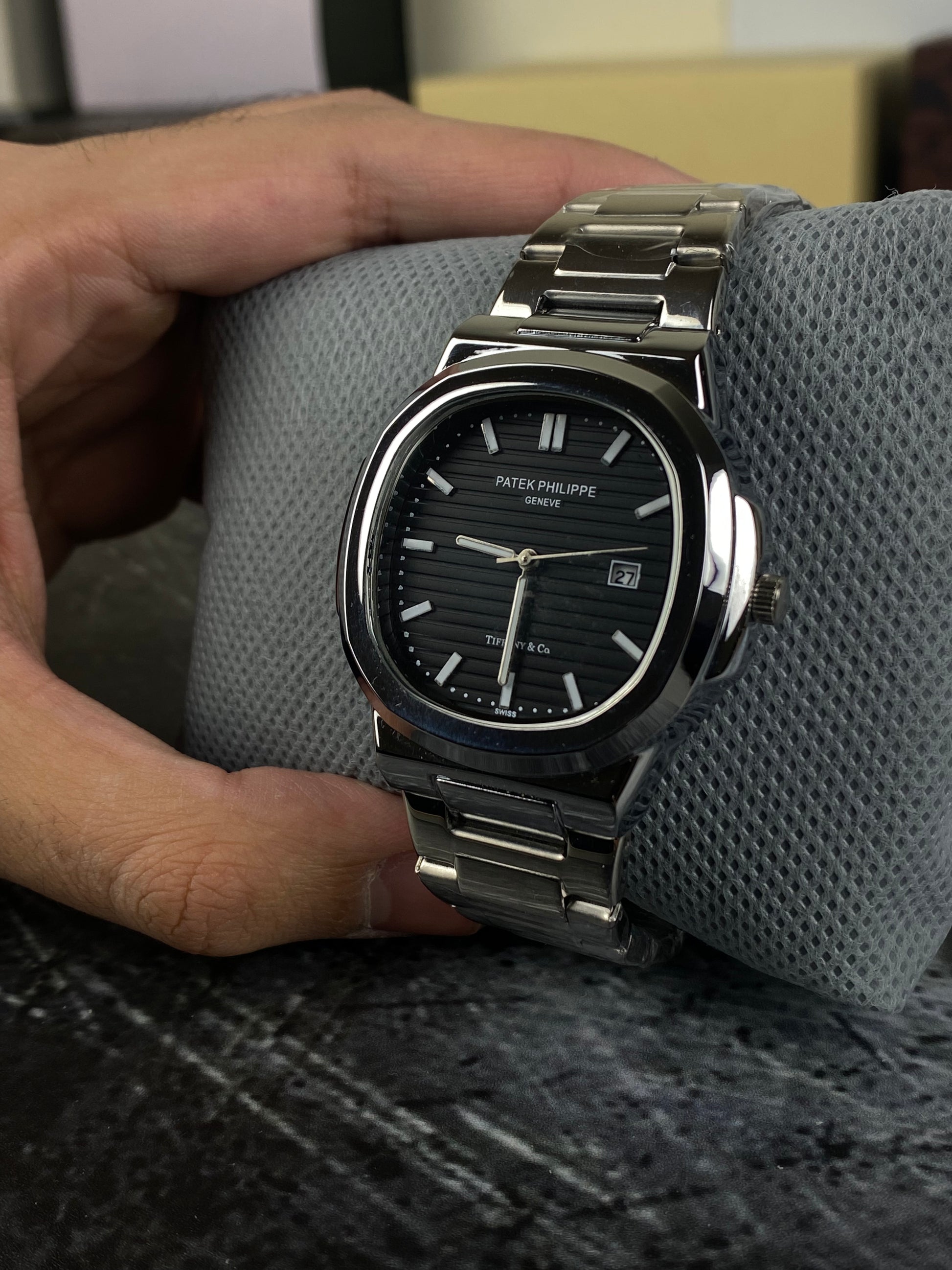 The PTK Nautilus 5711/1A embodies pure sophistication, striking the perfect balance between sport and elegance. Crafted from polished stainless steel and finished with a striking black dial, it remains one of the most coveted timepieces in modern watchmaking.