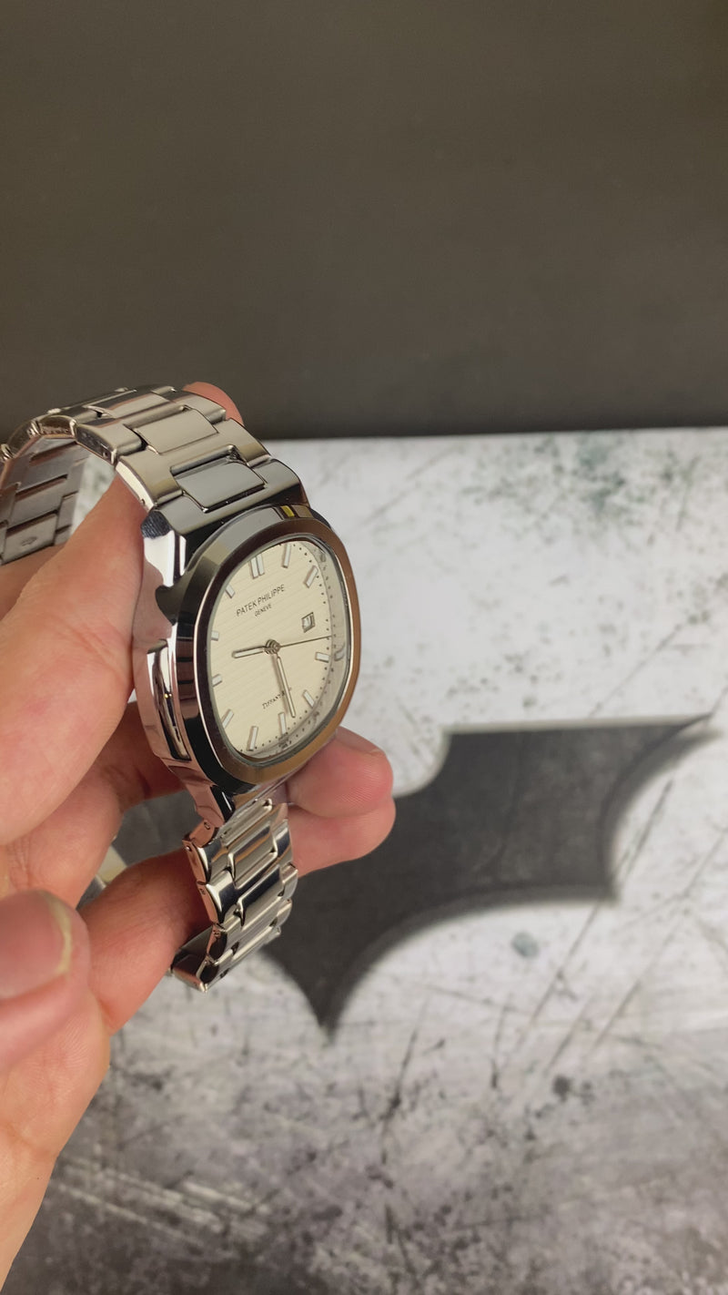 Horizontal-embossed silver dial exuding understated luxury and classic Nautilus character.